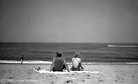 A couple sitting on a towel on the sand of a beach in front of the Atlantic Ocean in New England, United States.